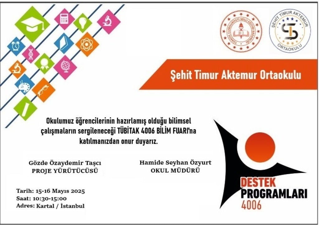 15-16 MAYIS 2025 TE OKULUMUZ ÖĞRENCİLERİNİN HAZIRLAMIŞ OLDUĞU TÜBİTAK 4006 BİLİM FUARINA TÜM VELİLERİMİZ DAVETLİDİR.